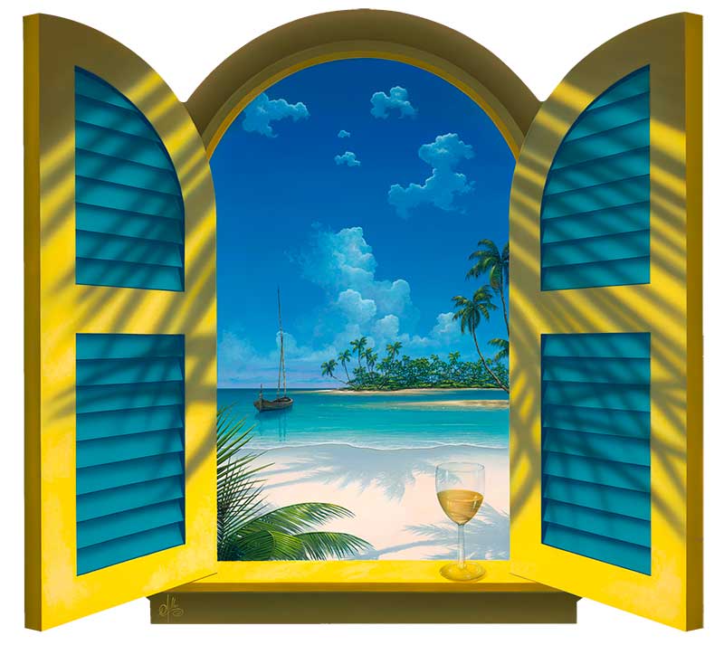 An open window's view of a pristine sandy beach and a glass of Chardonnay. Relax and enjoy.